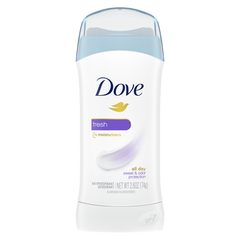 Dove Invisible Solid Fresh Antiperspirant Deodorant Stick is the perfect choice for all-day underarm protection and a fresh scent. Formulated with ¼ moisturizers, this antiperspirant for women leaves your underarm skin feeling soft and smooth while providing up to 48 hours of protection from sweat and odor. It's easy to apply, gliding on with no white residue and no alcohol (ethanol) to irritate or dry out your skin. Plus, this cruelty-free antiperspirant is guaranteed by PETA, so you can feel confident that you're using a product that won't harm animals. With Dove Invisible Solid Fresh Antiperspirant Deodorant Stick, you can enjoy long-lasting freshness and the assurance of all-day protection.